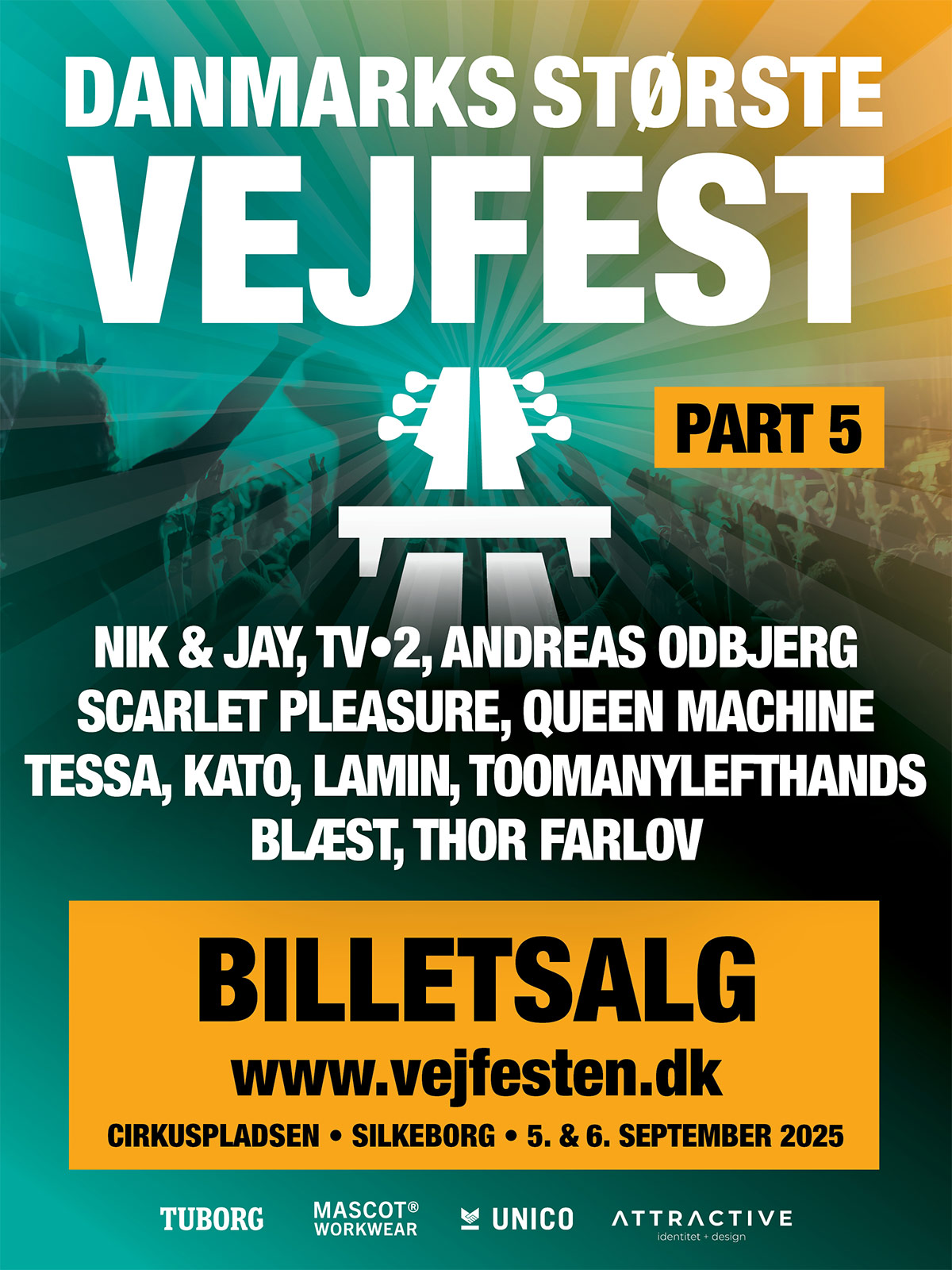 I 2025 var Cirkuspladsen endnu engang besøgt af mere end 11.000 pr dag. Festivalen bød igen på strålende sensommervejr og to fantastiske dage med god musik fra blandt andet Nik & Jay, Lamin, Tessa, Kato og Scarlet pleasure. Endnu en gang blev Danmarks Største Vejfest den perfekte afslutning på festivalsæsonen i høj sol og fremragende selskab.